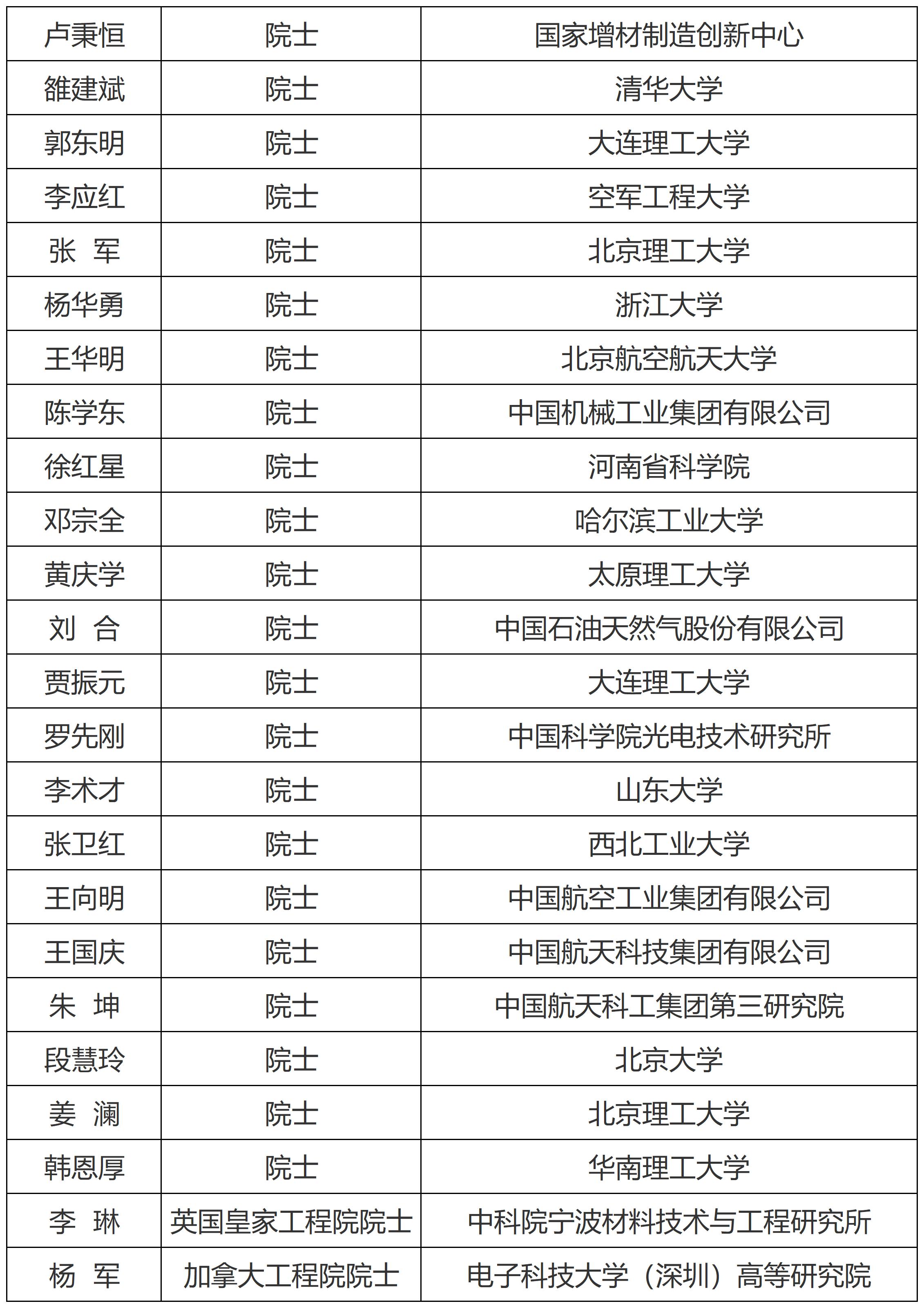 卢秉恒、林忠钦、郭东明、雒建斌、朱荻、李应红、杨华勇、王华明、谢建新、姜会林、徐红星、黄庆学、罗先刚、李景虹、冷劲松、王国庆、王向明、张荻、韩恩厚、段慧玲、郭旭、张学军、李琳、吕坚、王德成
